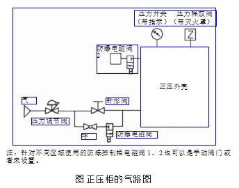正壓柜的空氣回路如下圖所示。通風時,防爆電磁閥1和防爆電磁閥2同時打開。壓縮空氣經調壓閥減壓后,一路從針閥節流進入正壓外殼,另一路通過防爆電磁閥1進入外殼。外殼中的氣體通過防爆電磁閥2排出。為了防止外殼中的壓力急劇上升并由于通過防爆電磁閥1的過量流量而損壞外殼,在旁路電磁閥1的前面安裝了一個球閥作為節流閥,以限制通過電磁閥1的流量并基本上平衡流入和流出正壓外殼的流量。泄壓閥既可用作排氣口,也可用作安全閥。正常運行時,電磁閥1和電磁閥2關閉,壓縮空氣由調壓閥減壓,由針閥節流,然后進入正壓外殼,空氣從泄壓閥的排氣孔排出。