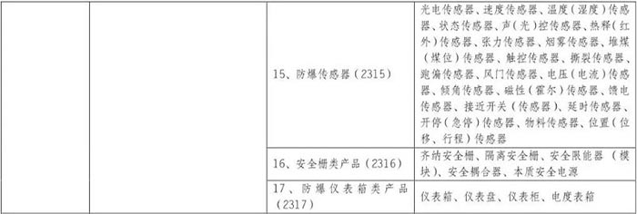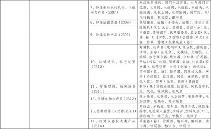 根據2019年7月5日市場監管總局發布的《市場監管總局關于防爆電氣產品從生產許可到強制性產品認證管理實施要求的通知》(2019年第34號),防爆電氣產品認證范圍適用于一類、二類和三類產品產品包括:防爆電機;防爆電動泵;防爆配電設備產品;防爆開關、控制和保護產品;防爆起動器產品;防爆變壓器產品;防爆電動執行器和電磁閥;防爆插件裝置;防爆監控產品;防爆通信和信號裝置;防爆空調和通風設備;防爆電加熱產品;防爆附件、防爆組件;防爆儀器儀表產品;防爆傳感器;安全屏障產品;防爆儀表箱產品共有17大類158種產品,認證產品的范圍和相應的產品類別代碼如下: