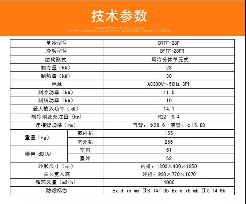 防爆空調(diào)機(jī)室 內(nèi)機(jī)(單元式)x1臺、防爆空調(diào)機(jī)室外機(jī)x1臺、電源線x6米、聯(lián)機(jī)線8米、密封膠泥x1塊、包扎帶x2卷、安裝使用說明書x1份、防爆合格證x1份、出廠合格證x1份、裝箱清單 x1份、吹塑水管x1根